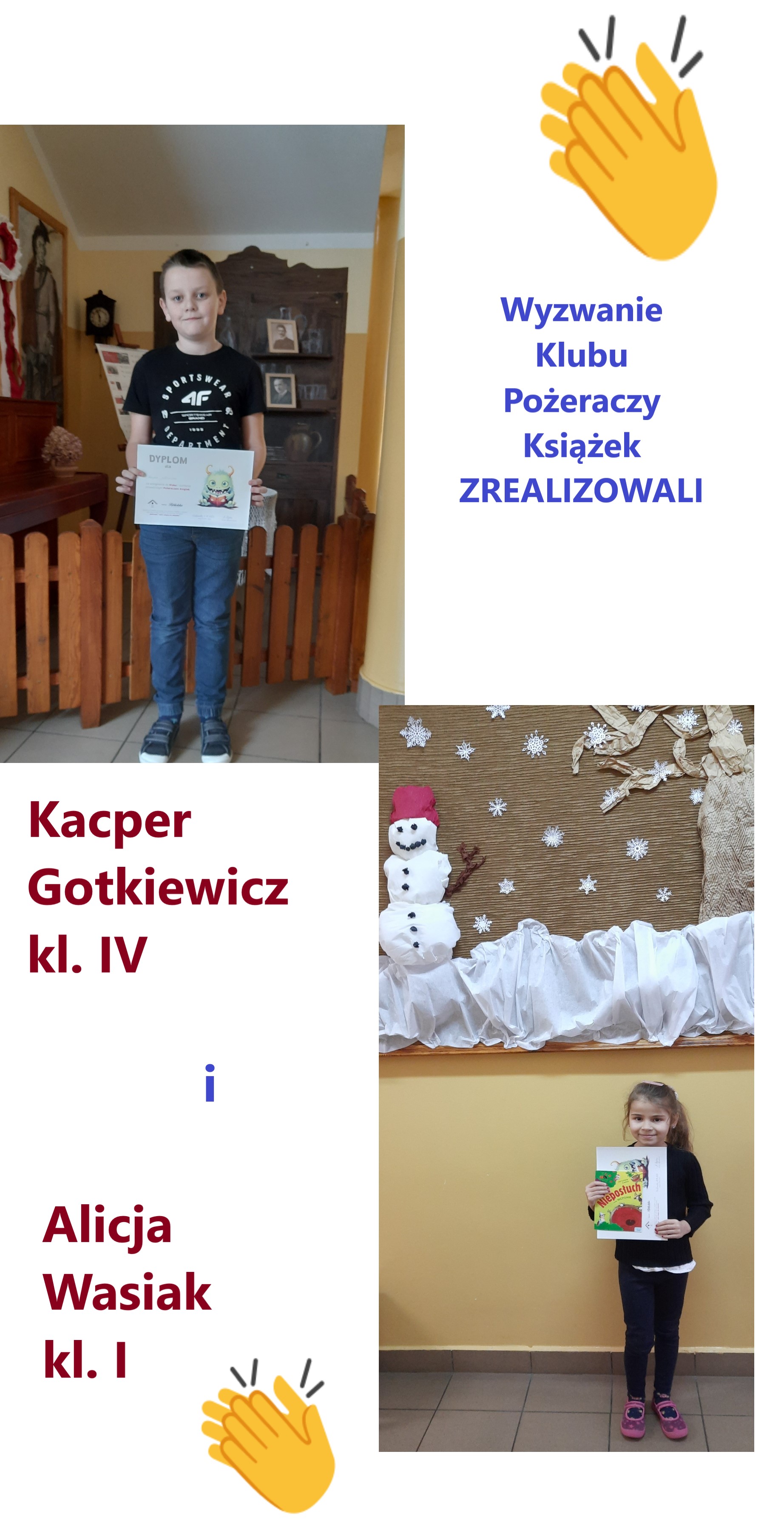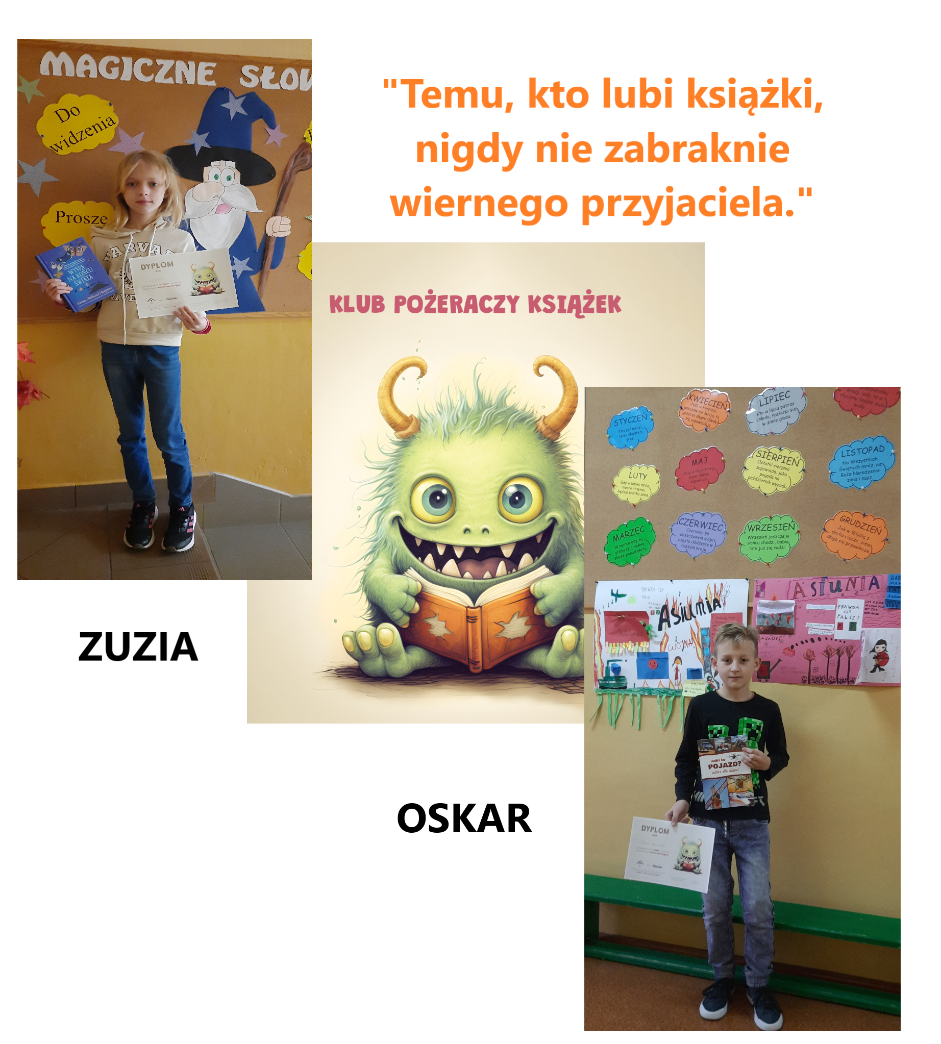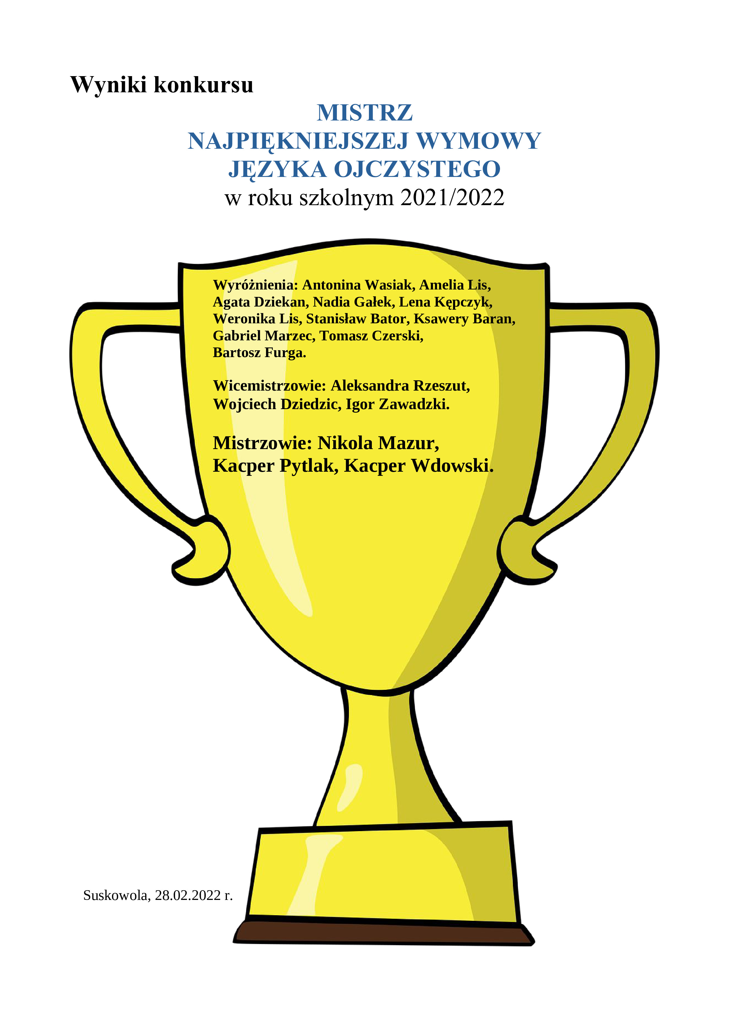 Matylda Golisz (kl. I), Lena Jeleń (kl. I), Kaja Cieślik (kl. I), Oliwia Rzeszut (kl. I), Jagoda Hernik (kl. I), Lena Misalska (kl. II), Iga Misalska (kl. II), Oliwia Dziak (kl. II), Tomasz Bąk (kl. II), Mert Wróbel (kl. II), Iwo Smal (kl. IV), Zofia Jurek (kl. V), Hanna Dziekan (kl. V), Nadia Iwanowska (kl. VI), Natan Smal (kl. VI).
