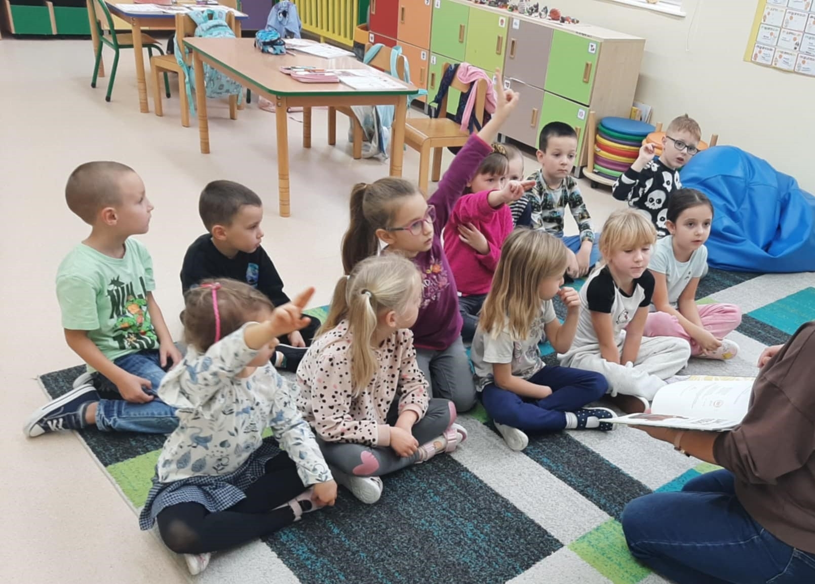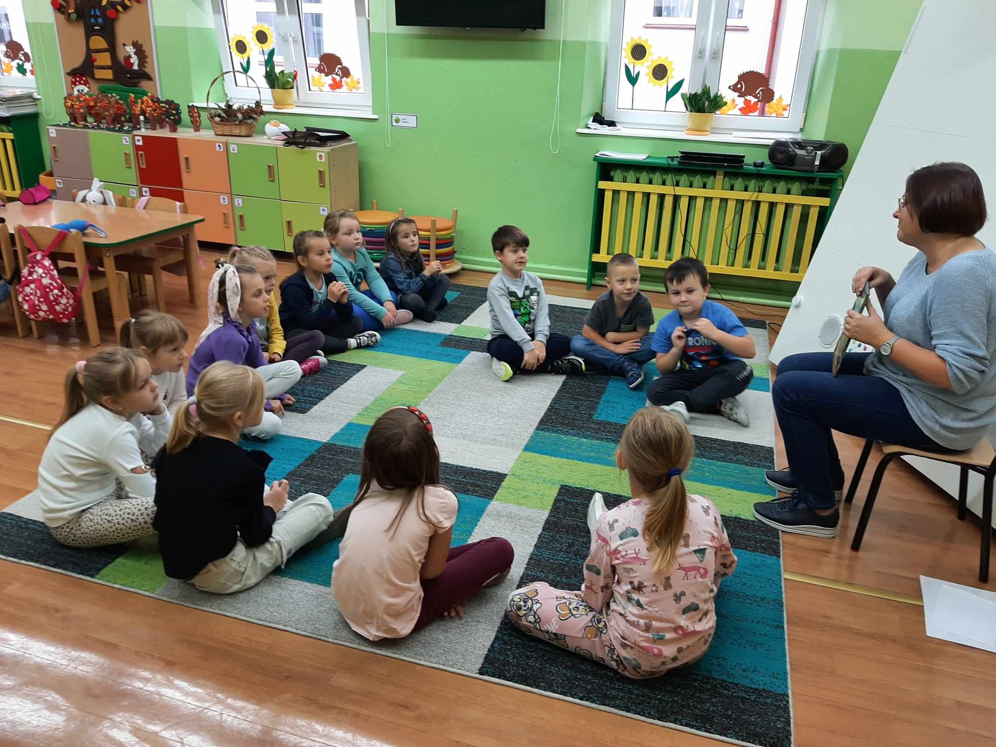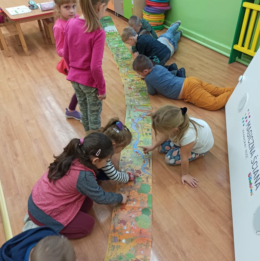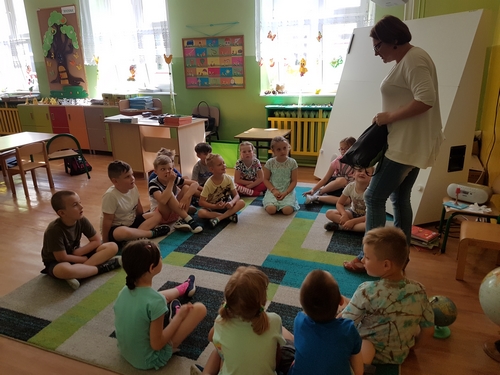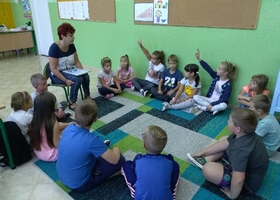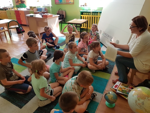 Uczniowie zerówki wzięli udział w zajęciach, podczas których poznali historię „Smoka spod Wawelu” W. Widłaka. Wysłuchali tekstu, a następnie wspólnie opowiedzieli całą historyjkę o smoku. Potem zamienili się w aktorów i odegrali teatralną scenkę inspirowaną opowieścią.