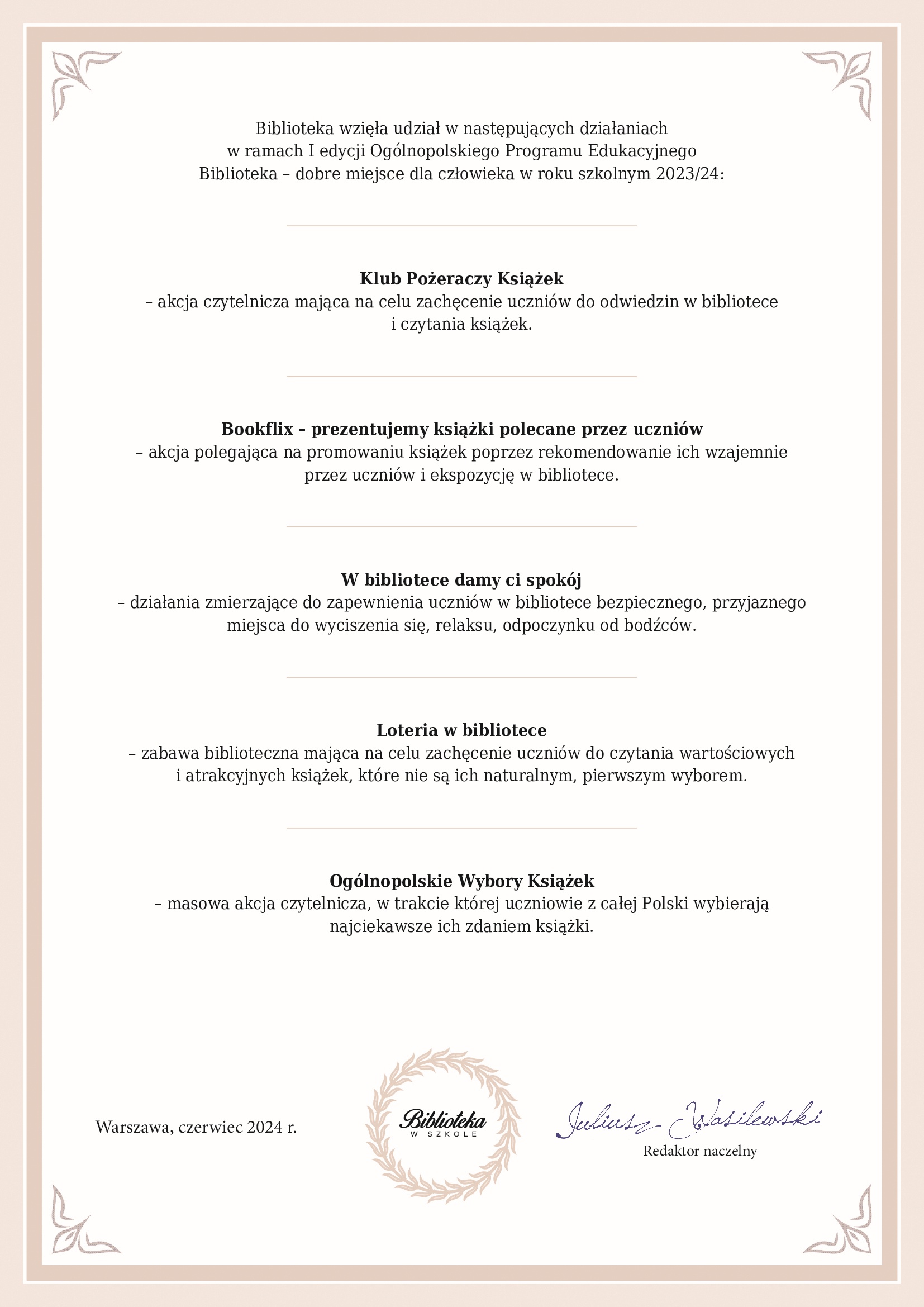 Bibliotekę szkolną w realizacji zabawy wspierały pożeraczki książek, czyli Panie: B. Dyczkowska, M. Niemirska, M. Samela-Grabiec i D. Jasiuk.