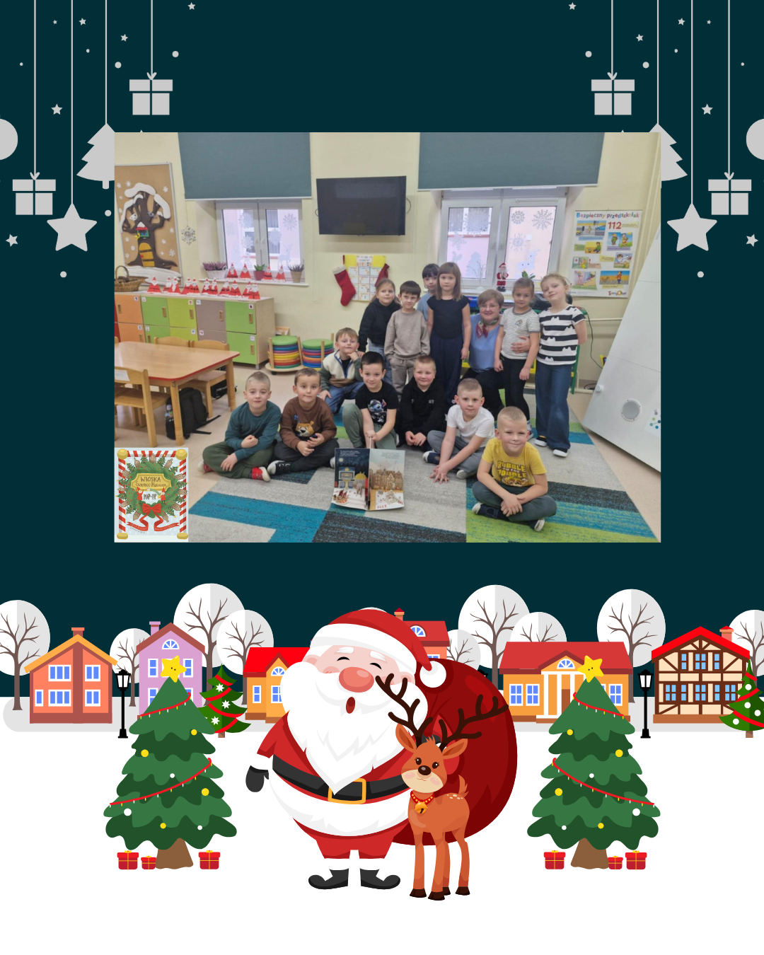 Na grudniowym spotkaniu dzieci z zerówki poznały niezwykłą książkę - rozkładankę - pt. "Wioska Świętego Mikołaja". Ilustracje A. Bukowy i tekst P. Płatkowskiej spodobały się uczniom.