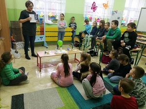 Takie było zadanie błyskawicznego konkursu zorganizowanego przed wiosenną przerwą świąteczną. Nagrodzeni - Nikola (kl. V), Zuzia (kl. V) Iwo (kl. III) oraz Kaja, Oliwia, Hania i Matylda (kl. "0") - otrzymali m.in. kawałek przyrody.