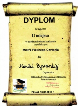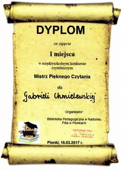W czwartek 16.03.2017 r. w Bibliotece Pedagogicznej w Pionkach odbył się międzyszkolny konkurs czytelniczy - "Mistrz Pięknego Czytania" . Wzięło w nim udział 17 najlepiej czytających uczniów z klas III i IV szkół podstawowych, z terenu miasta i gminy Pionki. Uczestnicy mieli za zadanie pięknie przeczytać przygotowany wcześniej fragment książki (klasy III - O zajączku Filipie, który ze strachu dokonał wielkich czynów Elżbiety Zubrzyckiej; klasy IV - "Momo" Michaela Ende lub "Emil ze Smalandii" Astrid Lindgren) oraz już bez przygotowania przeczytać fragment innej, wskazanej przez komisję konkursową, powieści dla dzieci.