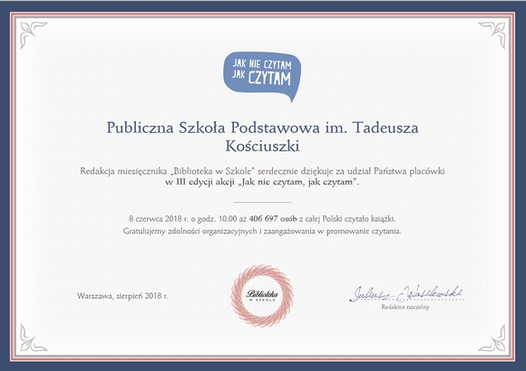 Ponieważ czytamy, przyłączyliśmy się do ogólnopolskiej akcji "Jak nie czytam, jak czytam", której pomysłodawcą i głównym organizatorem jest redakcja miesięcznika "Biblioteka w Szkole". W zeszłym roku akcja zgromadziła 459 409 uczestników. Mamy nadzieję, że nasz udział przyczyni się do ustanowienia nowego rekordu i pokazania, że czytanie to świetna rzecz.