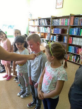 Następnie uzbrojone w zakładki do książek przeszły do biblioteki, złożyły uroczyste przyrzeczenie i po raz pierwszy samodzielnie wypożyczyły wybrane przez siebie książeczki. Pani Alicja miała dla nowych czytelników jeszcze niespodziankę. Opowiedziała o tym, że są wyrazy, które mają wiele znaczeń, a potem przeczytała wierszyk pana Michała Rusinka pt. "Zamek" i zachęciła do sięgnięcia po całość zbioru wierszy, który już wkrótce będzie można wypożyczyć. "Rycerze włożyli zakładki do książek, wzięli listy skierowane do rodziców i wrócili do swojej sali. Pani Alicja na pewno rzuciła książkowy czar na dzieci, ponieważ przychodząc do biblioteki systematycznie.