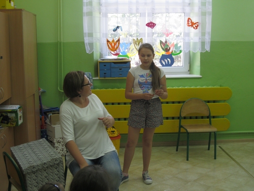 Dziewczęta z gimnazjum: Angelika, Julia i Marysia przeczytały przedszkolakom wiersz Juliana Tuwima pt. "Słoń Trąbalski" i zaprosiły dzieci do wspólnej zabawy.