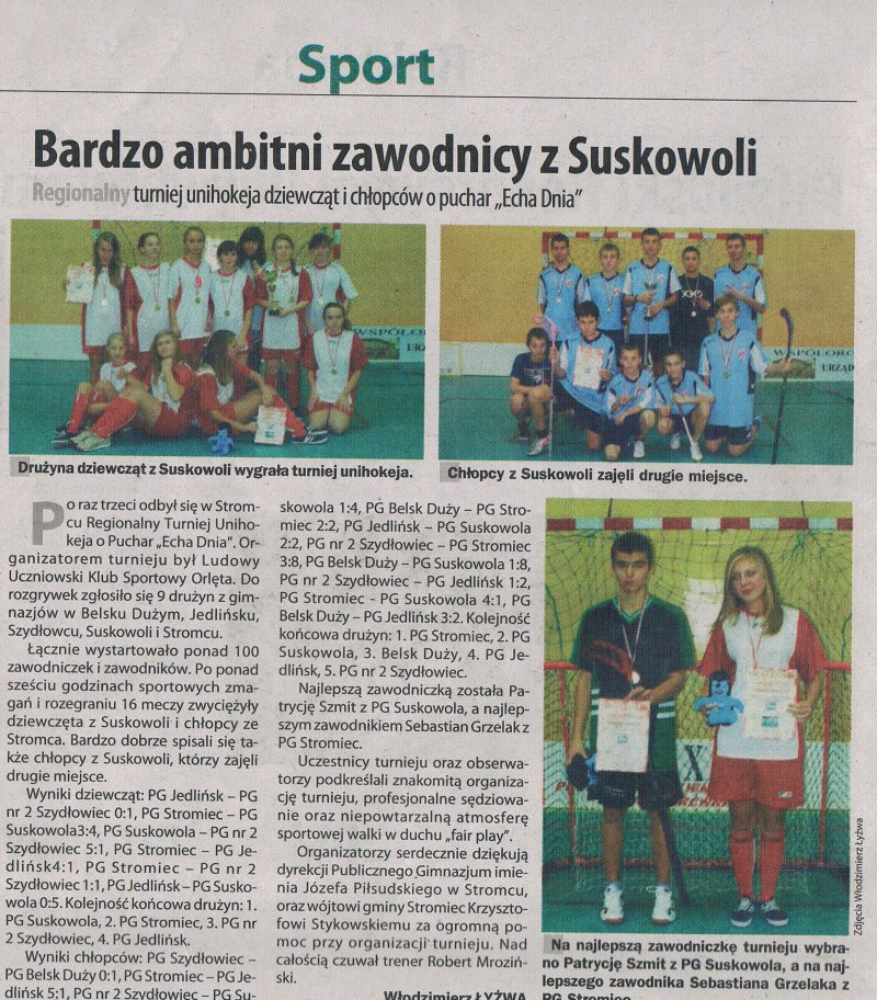 W finałach międzypowiatowych XIV Mazowieckich Igrzysk Młodzieży Szkolnej SZS reprezentacje naszego gimnazjum w unihokeju uzyskały awans do finału wojewódzkiego, który odbędzie się na początku czerwca w Gostyninie. Dziewczęta wygrały zawody pokonując w swojej grupie eliminacyjnej PG Radom nr 13 4:0, PG Stromiec 3:1 oraz PG nr 2 z Szydłowca 1:0. w Pólfinale nasze dziewczęta pokonały PG Jedlińsk 3:0, by w finale pokonać dziewczęta z PG Goszczyn 1:0. Po raz 12 nasza szkoła będzie reprezentowana na finale wojewódzkim przez damską reprezentację unihokeja.