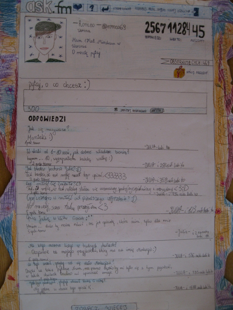 W Ic na wyróżnienie zasłużyła prezentacja Julii, Natalii i Moniki. Portret Julii Capuletti był niezwykle pomysłowy. Równie ciekawy pomysł przyszedł do głowy Natalii i Wiktorii. Klaudia opracowała list gończy! Poszukiwany? Oczywiście Romeo! Bartek napisał artykuł do gazety.