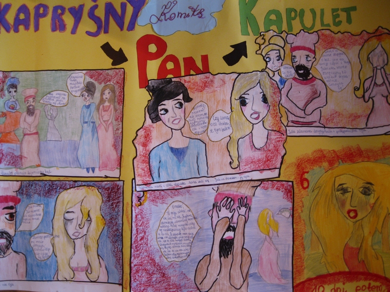 Na lekcji języka polskiego uczniowie z klasy Ib, c i d mieli w oryginalny sposób zaprezentować bohaterów "Romea i Julii". Niezwykle ciekawe prezentacje przygotowała Ib. Olwia wcieliła się w postać Tybalta (była nawet ranna). Michał, Bartek i Jakub posłużyli się mapą myśli. Damian przedstawił Martę. Paulina i Julia pokazały fragment strony internetowej. Agata i Ola zaproponowały grę dydaktyczną na podstawie lektury. Zagrała cała klasa, dopingowana przez Olę, która w podskokach rozdawała pytania. Na dodatek Agata nagrodziła wszystkich słodkościami. Hubert z Szymonem opracowali krzyżówkę. Były również wywiady. Magda, Natalia i Patryk zadabali o nagłośnienie i rekwizyty. Patryk w roli Romea – widok naprawdę niecodzienny! Natalia i Kasia porozmawiały o ojcu Laurentym, Marcin (ukryty talent aktorski?) i Bartosz – o Julii, Weronika i Karina – o Merkucju . Weronika wcieliła się w postać Romea. Karina wyjaśniła znaczenie imienia Merkucjo.