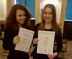 Nasze urocze uczennice z IIIc - Wiktoria Zawadzka i Klaudia Świątek - wróciły z turnieju z nagrodami. Zwiewna, delikatna Wiktoria uwodziła, zasmucała i cieszyła widzów, recytując kwestię Laury z utworu F. Karpińskiego pt. "Laura i Filon". Poruszyła również swoją interpretacją fragm. "Lilli Wenedy" Juliusza Słowackiego. "Jak ładnie" - odezwały się szepty słuchających występu - powiedziała p. Agnieszka Olejarz, która zaproponowała dziewczętom udział w tym konkursie. Oczywiście Wiktoria została zauważona także przez jury i wyróżniona.
