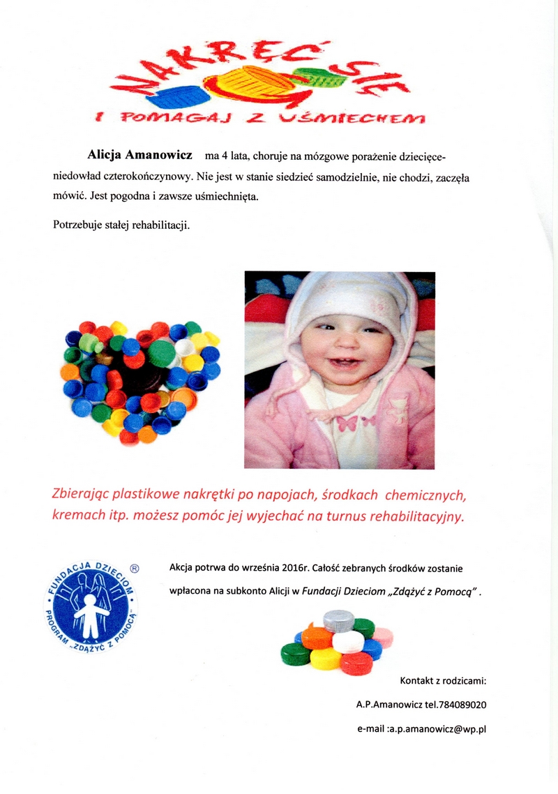 Kontynuujemy akcję zbierania nakrętek. Podobnie jak w latach ubiegłych każda klasa może pomóc choremu dziecku. W tym roku szkolnym zbieramy nakrętki dla czteroletniej Alicji Amanowicz.