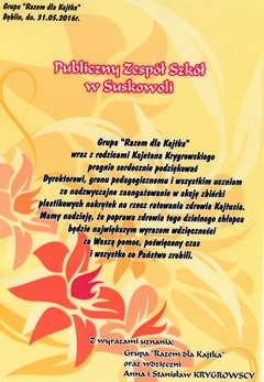 20 czerwca 2016 roku zakończyliśmy akcję zbiórki plastikowych nakrętek dla Kajetana Krygrowskiego. W roku szkolnym 2015/2016 uczniowie gimnazjum, szkoły podstawowej oraz przedszkolaki zebrali 1110 kg nakrętek. Najwięcej, jak co roku, zebrała klasa III c 681,6 kg, II miejsce zajęła klasa III a - 104,7 kg, III miejsce przedszkolaki - 50 kg. Koordynatorem akcji były: Iwona Sutkowska i Alicja Rutkowska - Struzik. Dziękujemy bardzo uczennicom klasy III c: Julii Łukasiewicz, Monice i Natalii Jurek, które przez cały okres zbiórki były bardzo zaangażowane przy ważeniu, porządkowaniu i podliczaniu nakrętek. Akcja została posumowana na zakończeniu roku szkolnego, a wszyscy uczniowie nagrodzeni słodyczami. Wszyscy nauczyciele i uczniowie naszej szkoły życzą Kajtusiowi szybkiej poprawy zdrowia. |