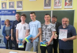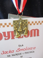 Ostatecznie turniej warcabowy wygrał uczeń klasy IIa Jacek Smolarz, sensacyjnie na drugim miejscu uplasował się uczeń klasy II szkoły podstawowej Kornel Warszakowski. Trzecie miejsce przypadło w udziale Patrykowi Zagożdżonowi z klasy IIb gimnazjum, a na czwartym nagradzanym miejscu zasiadł Mikołaj Kazberuk, również uczeń klasy II szkoły podstawowej. Pamiątkowe puchary i dyplomy wręczała Pani Dyrektor Ewa Pałucka. Każdy zawodnik finałowej rozgrywki otrzymał również nagrodę rzeczową w postaci elektronicznych gadżetów. Turniej zorganizowany został przez opiekunów Szkolnego Koła Gier Logicznych p.Iwonę Sutkowską, p. Jakuba Jaska oraz p. Dariusza Czyżewskiego. |