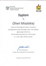 | Angelika Mucha z klasy Ic została nagrodzona w XIV edycji Konkursu Ekologicznego „Czystym powietrzem oddychajmy, ŚMIECI NIE SPALAJMY”, organizowanego przez Samorząd Województwa Mazowieckiego. W tej edycji gimnazjaliści musieli napisać wiersz nawiązujący do pojęcia „niskiej emisji”. Opiekunem literackim Angeliki była Pani Agnieszka Olejarz. |