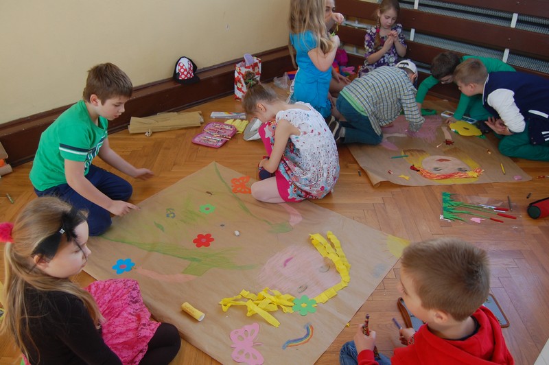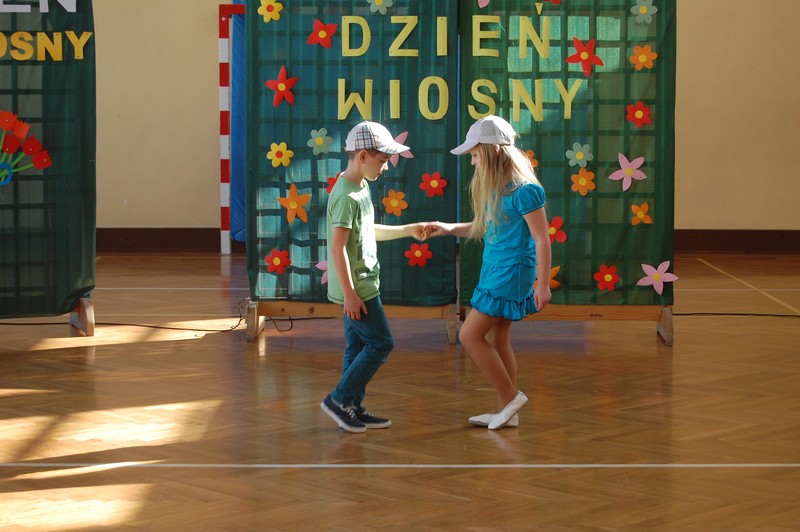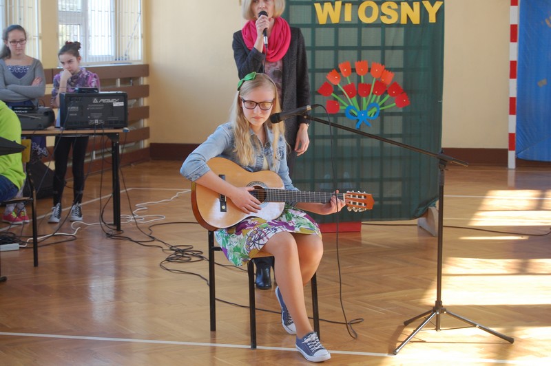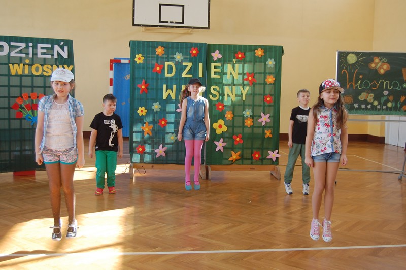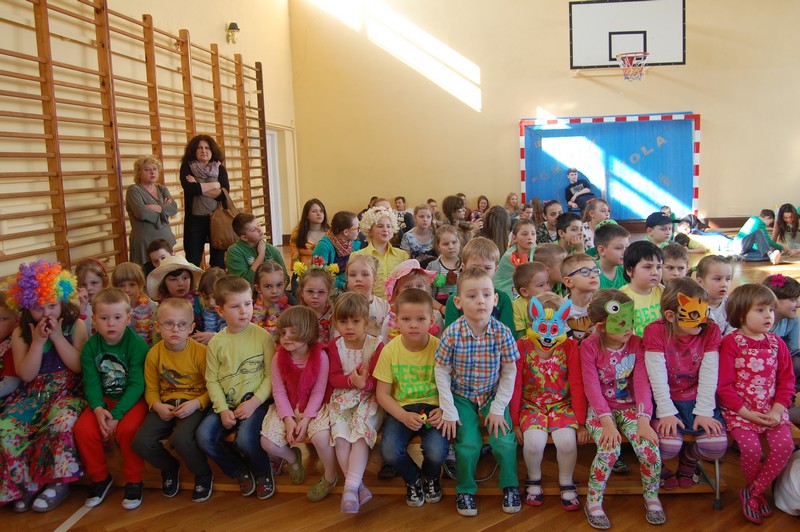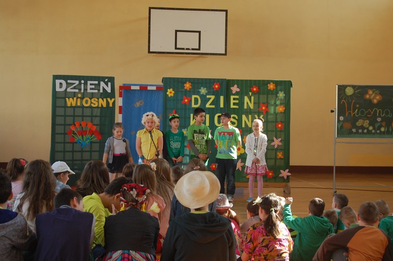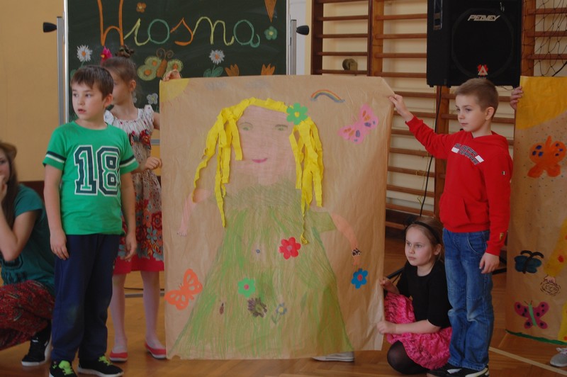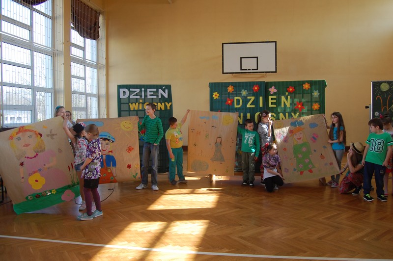 Samorząd Uczniowski przygotował uroczyste spotkanie dla uczniów klas 0-VI. Obowiązkowy strój tego dnia to barwy wiosny: zieleń, żółty i kwieciste wzory. Aby tradycji stało się zadość i zima na dobre nas opuściła każda klasa przygotowała żywą marzannę. Stroje były bardzo pomysłowe – po zaprezentowaniu się publiczności pożegnaliśmy marzanny. Następnym zadaniem było namalowanie przez każdą z klas portretu Pani Wiosny. Piękne plakaty udekorowały nasze szkolny korytarze i od razu zrobiło się weselej.
