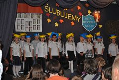 W czwartek 3 listopada 2011 roku pierwszaki z naszej szkoły złożyły uroczyste ślubowanie na sztandar szkoły i zostały pasowane na uczniów. Na scenie zaprezentowały, czego zdążyły się już nauczyć w szkole. Pięknie recytowały wiersze i śpiewały piosenki. Wykazały się wiadomościami dotyczącymi życia szkolnego oraz naszej Ojczyzny. Zromadzona publiczność gromkimi brawami nagrodziła ich wysiłek i potwierdziła, że zdali egzamin na ucznia. Pani Dyrektor ogromnym ołówkiem pasowała każdego pierwszaka na ucznia. Każdy otrzymał pamiątkowy dyplom oraz plakietkę. Rodzice wręczyli im piękne ołówki i zeszyty na dobry start. Po części oficjalnej dzieci wraz z rodzicami i zaproszonymi gośćmi udały się na słodki poczęstunek przygotowany przez rodziców. |