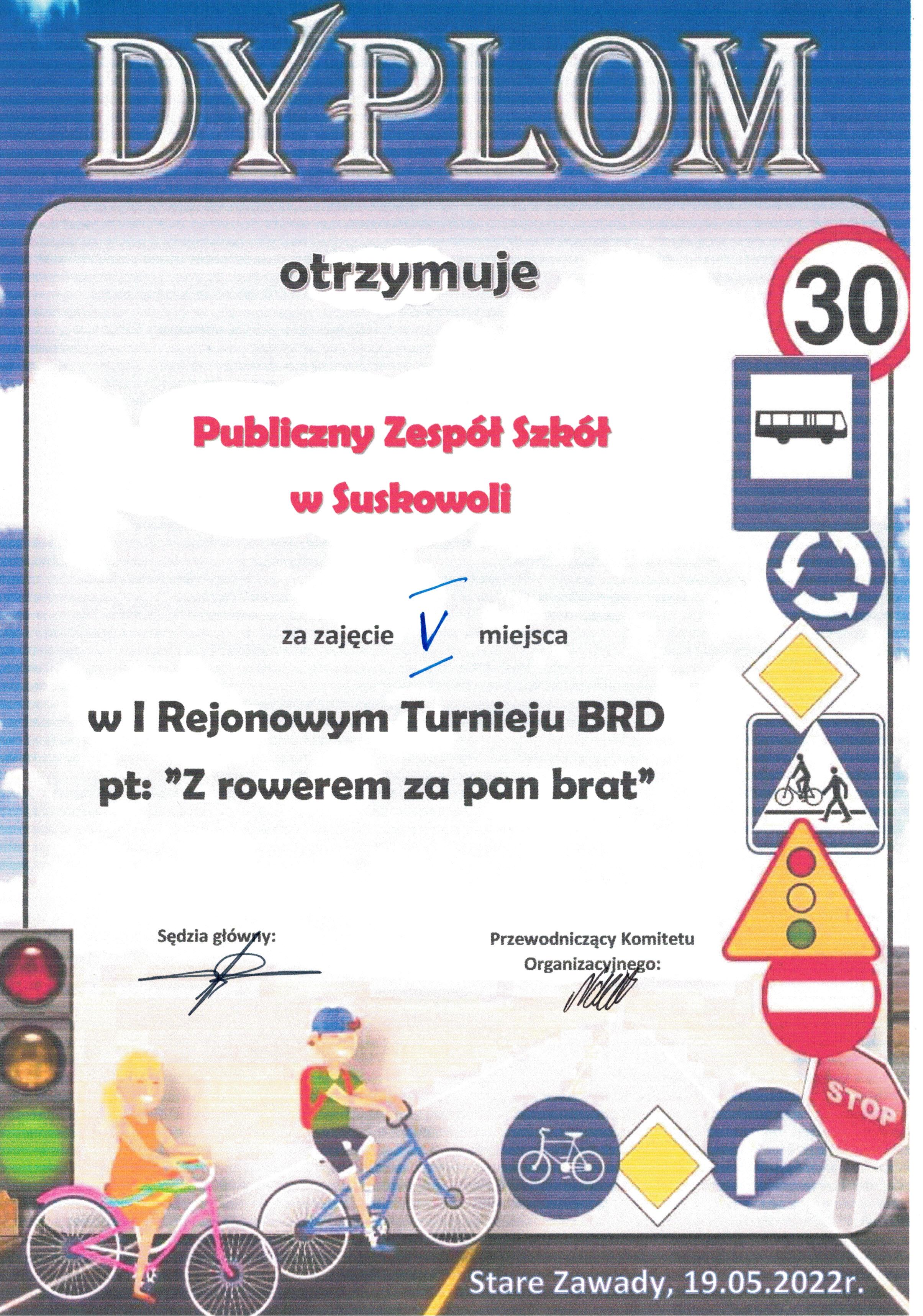 W dniu 19 maja 2022 roku uczniowie klasy V PSP w Suskowoli wzięli udział w I Regionalnym Turnieju BRD pt. "Z rowerem za pan brat", który odbył się w m. Stare Zawady. Drużyna 5 uczniów uczestniczyła w zmaganiach podczas rozwiązywania testu teoretycznego, jazdy po torze przeszkód oraz jeździe rowerem po miasteczku rowerowym. W teście teoretycznym najlepsze wyniki osiągnęli uczniowie Milena Mazur oraz Aleksander Szcześniak - obydwoje III miejsce w gronie 50 startujących uczestników. Wyniki pozostałych uczniów: VII miejsce Bartosz Marchewka, IX Janek Trybuła i XI miejsce dla Adama Połcia. W testach praktycznych czwórka naszych zawodników pokonał przejazd bezbłędnie, mały błąd popełnił jedynie Adam Połeć. Dzięki dobrym wynikom wszystkich konkurencji reprezentacja naszej szkoły wywalczyła V miejsce wśród 10 szkół biorących udział w turnieju BRD. Indywidualnie najlepszy wynik wynik z naszej szkoły uzyskała Milena Mazur. Pozostali uczniowie klasy V wzięli udział w zorganizowanym festynie, który obejmował: pokazy Straży Pożarnej z Jedlińska, pokazy sprzętu KM Policji w Radomiu, pokaz udzielania pierwszej pomocy przedmedycznej, labirynt rowerowy.
