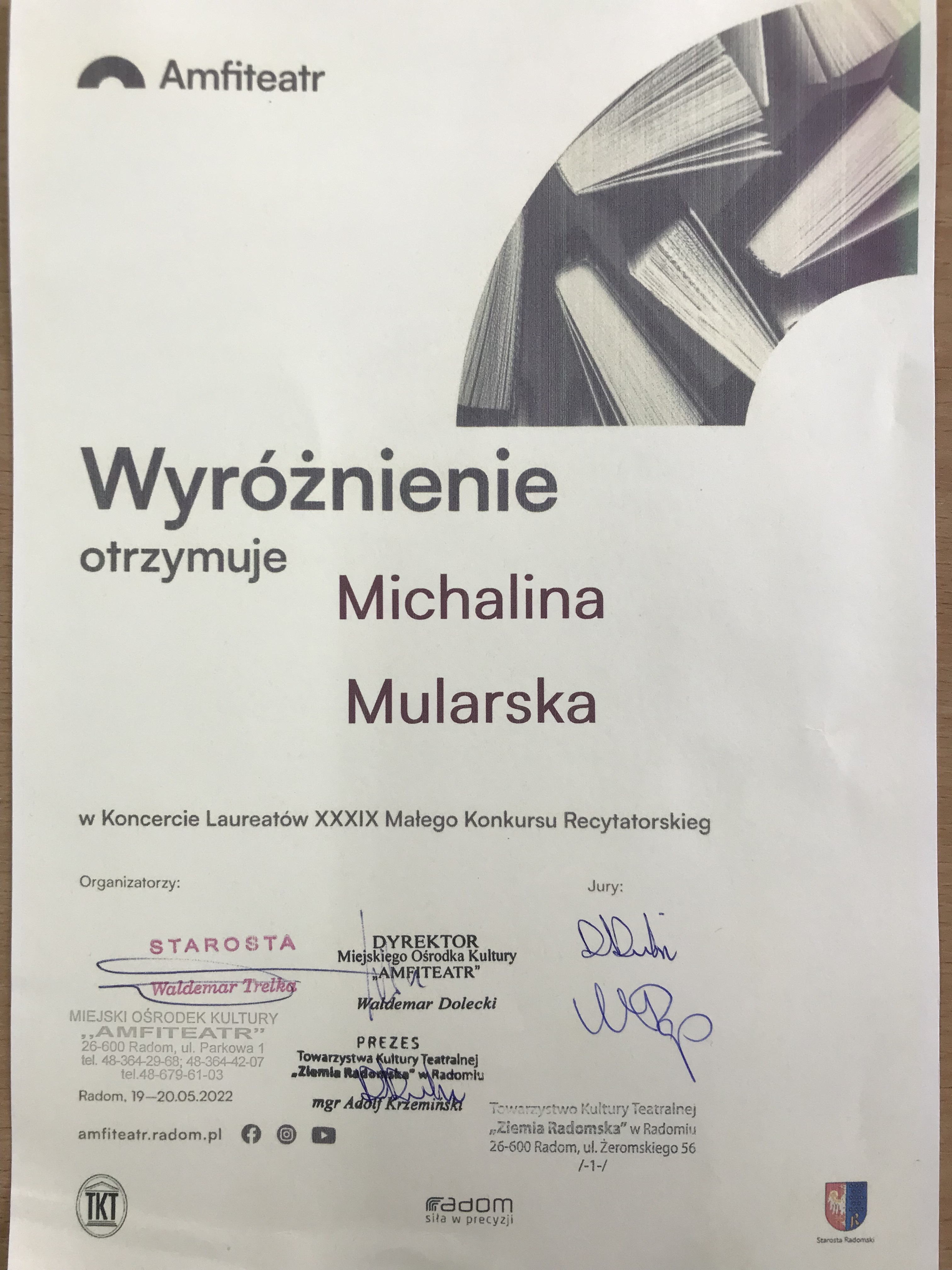 - wyróżnienie w Koncercie Laureatów XXXIX Małego Konkursu Recytatorskiego – organizator Towarzystwo Kultury Teatralnej „Ziemia Radomska” we współpracy z MOK „Amfiteatr” Radom
