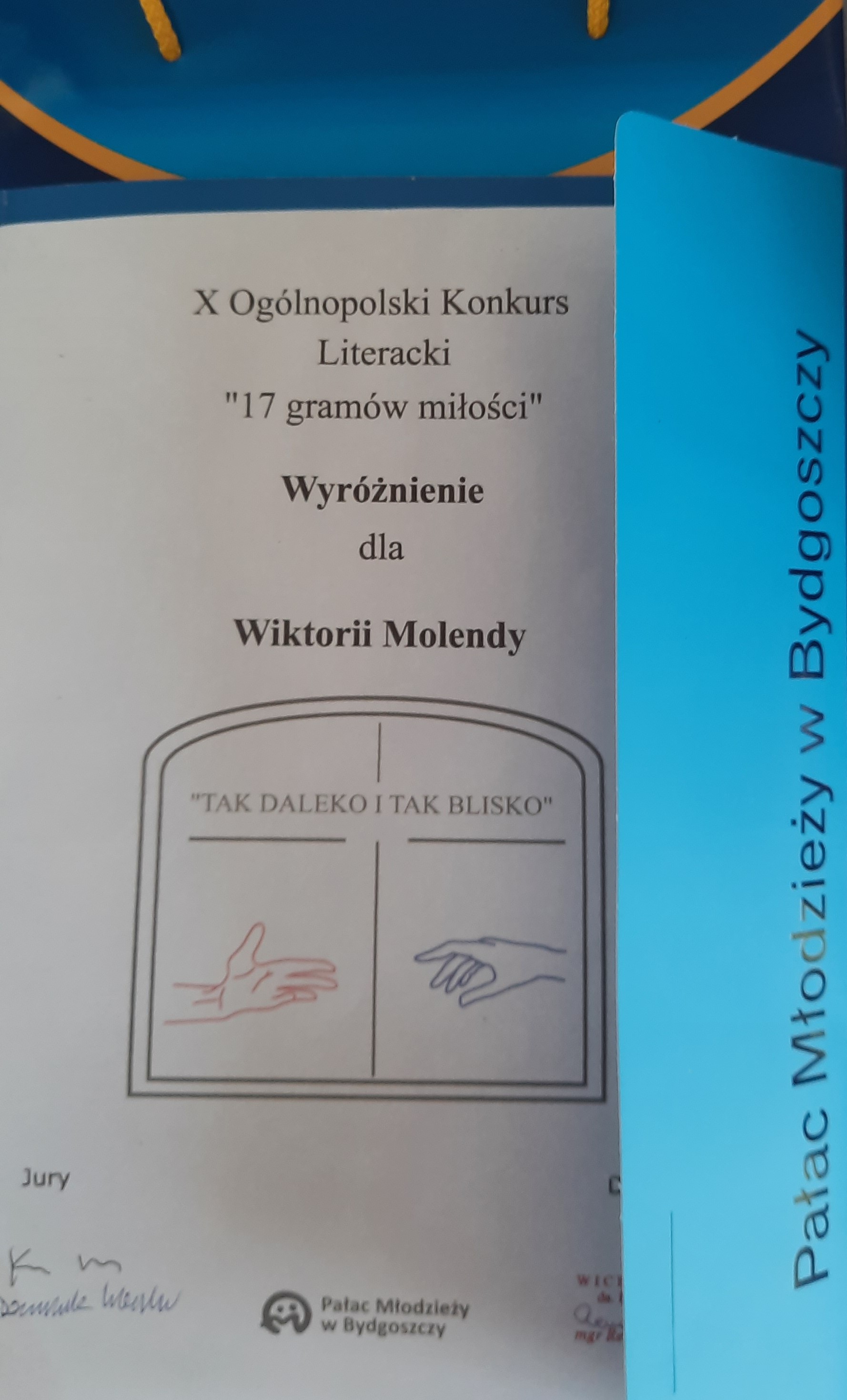 Z dumą informujemy, że Wiktoria Molenda z kl. 6 została wyróżniona w X Ogólnopolskim Konkursie Literackim "17 gramów miłości". Niesamowicie cieszymy się z osiągnięcia! Brawo!
