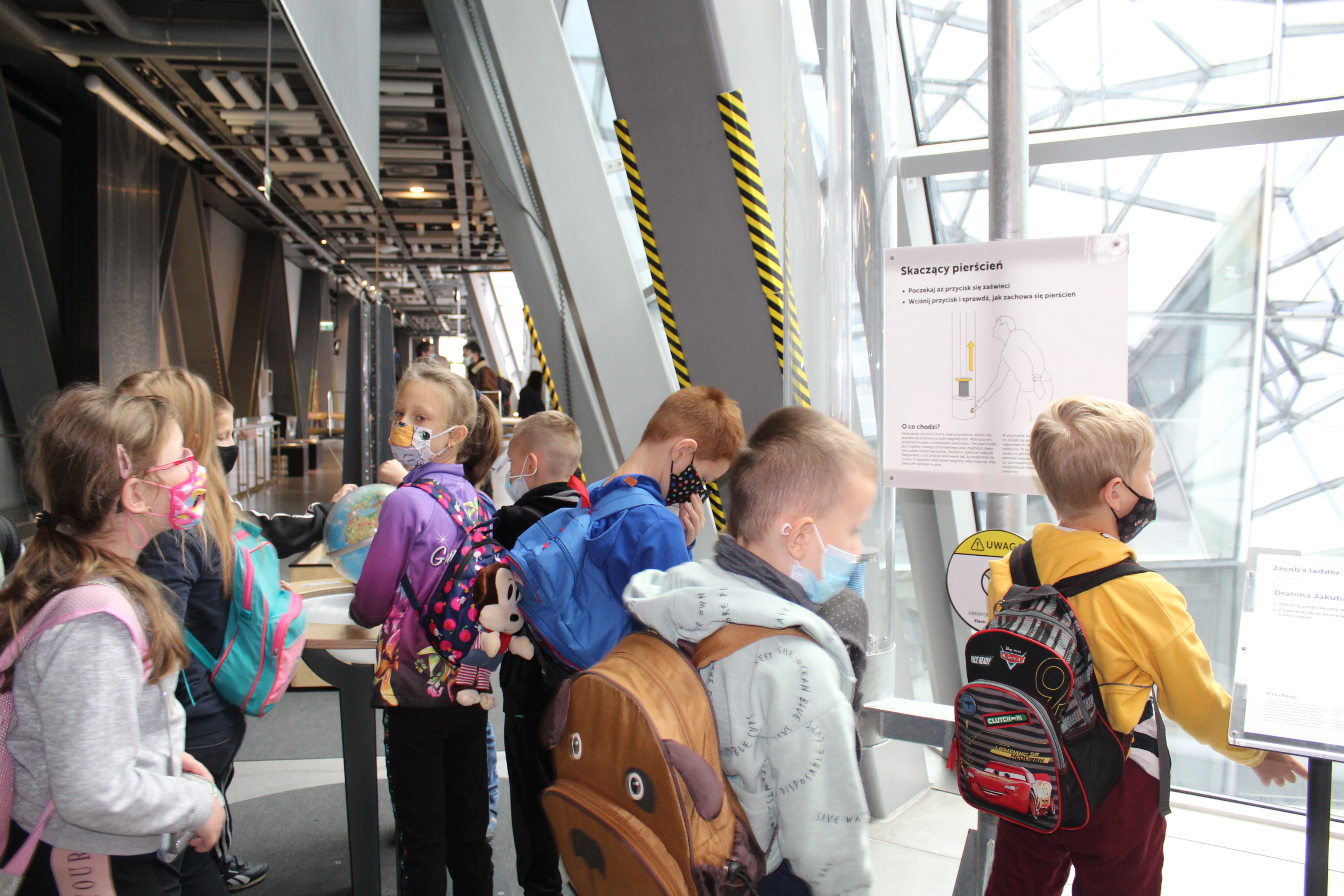 Wizytę w CNK rozpoczęliśmy od zwiedzania interaktywnych wystaw, na których znajduje się blisko 400 eksponatów. Zwiedzając obiekt CNK uczniowie mogli nie tylko oglądać, ale również przeprowadzać samodzielnie eksperymenty na poszczególnych stanowiskach. Dzięki temu dotychczas skomplikowane dla nich prawa przyrody stały się bardziej zrozumiałe i jasne. Przekonali się, że nauka to wciągająca i fascynująca przygoda. Kolejnym punktem naszej wycieczki była wizyta w Planetarium, gdzie uczestniczyliśmy w pokazie nieba i mogliśmy podziwiać kilkanaście milionów gwiazd. Sala pokazowa wyglądała zjawiskowo. W Planetarium uczestniczyliśmy również w projekcji filmu edukacyjnego pt. „Polaris”, z którego dzieci dowiedziały się czym jest zjawisko nocy polarnej. Po tak wyczerpującym zwiedzaniu dzieci posiliły się smacznym obiadem.