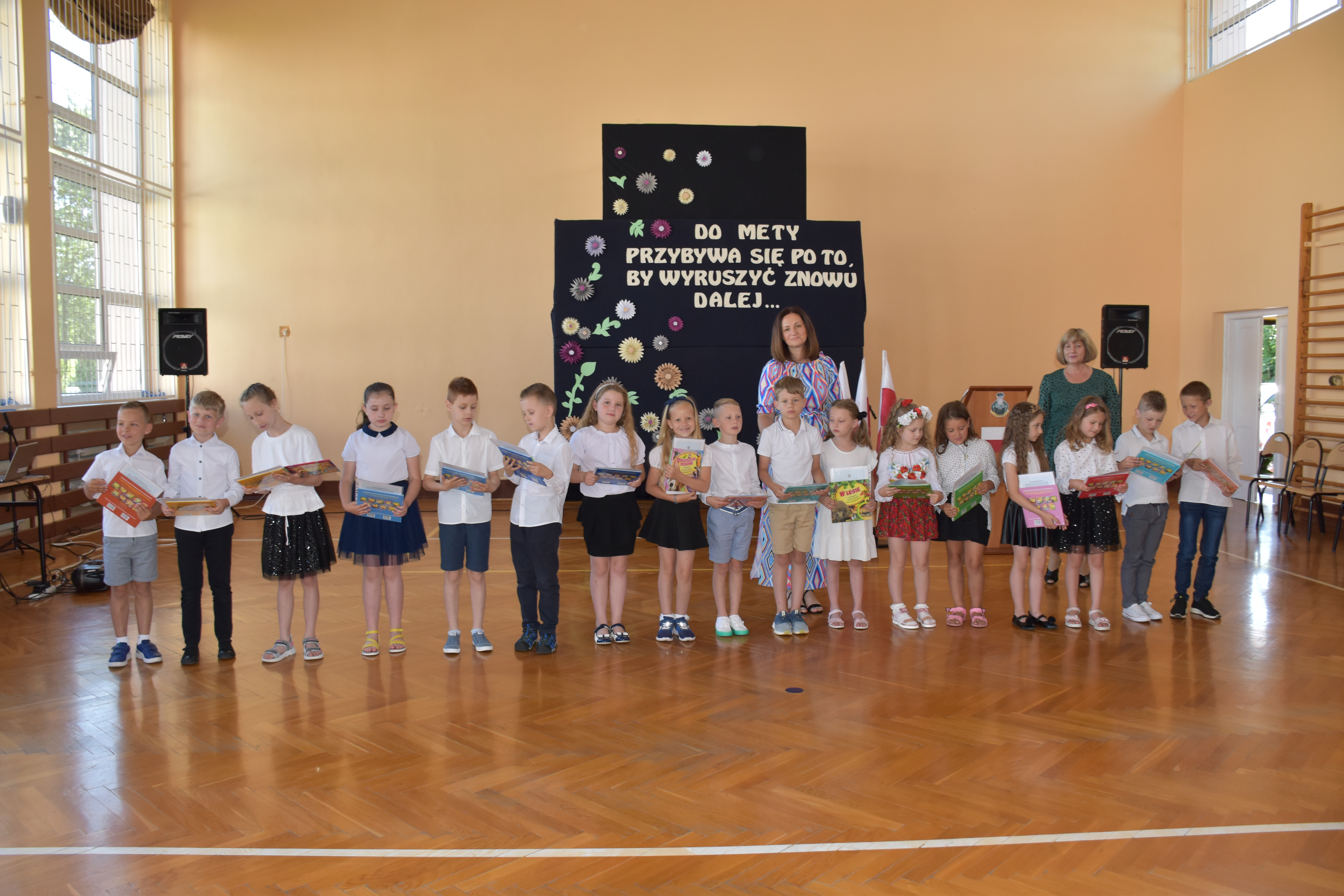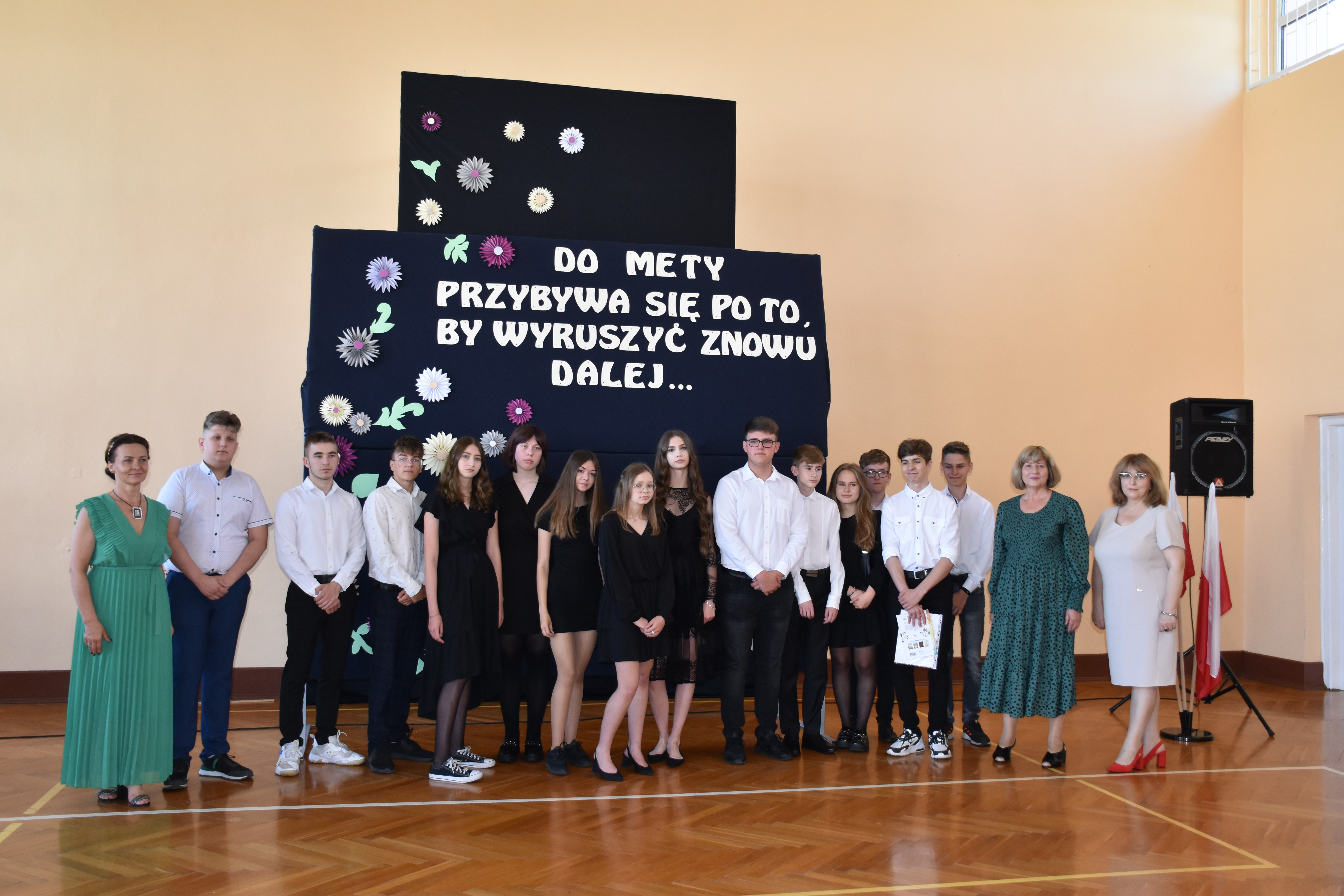 Dnia 24 czerwca 2022 r. w piątek odbyło się zakończenie roku szkolnego 2021/2022. Uczniowie klasy VIII przekazali sztandar szkoły młodszym kolegom i zatańczyli tradycyjnego poloneza. Pani Dyrektor Ewa Pałucka przedstawiła wyniki w nauce i zachowaniu, wyróżniła uczniów, którzy mieli najwyższą średnią ocen w szkole oraz podsumowała dokonania.