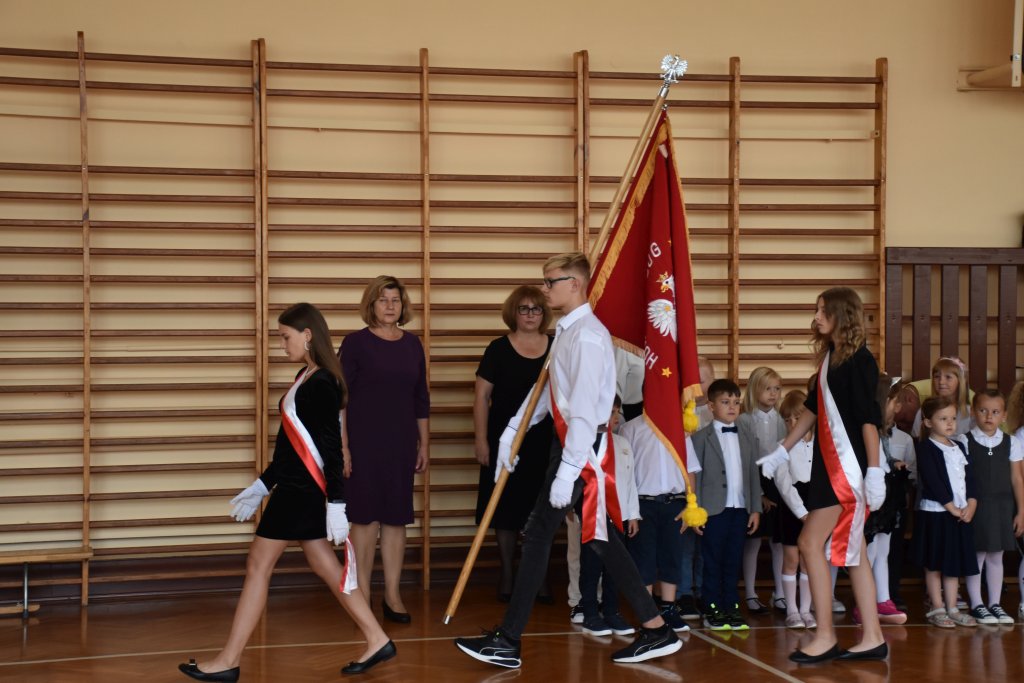 Uroczystość rozpoczęła się od przekazania sztandaru przez uczniów klasy VIII. Następnie Pani Dyrektor Ewa Pałucka przedstawiła osiągnięcia uczniów w konkursach i zawodach.