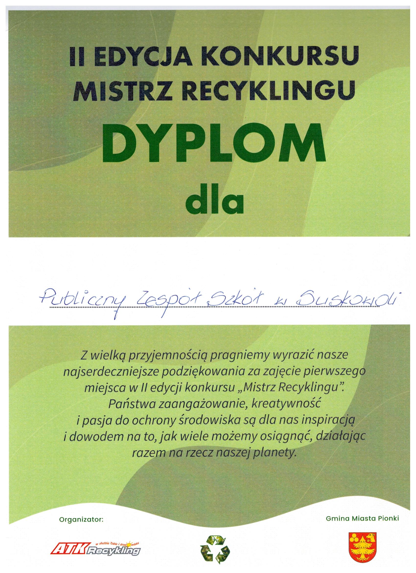 „Mistrz Recyklingu” organizowanym przez Przedsiębiorstwo Usług Komunalnych ATK Recykling Tomasz Kucharczyk.