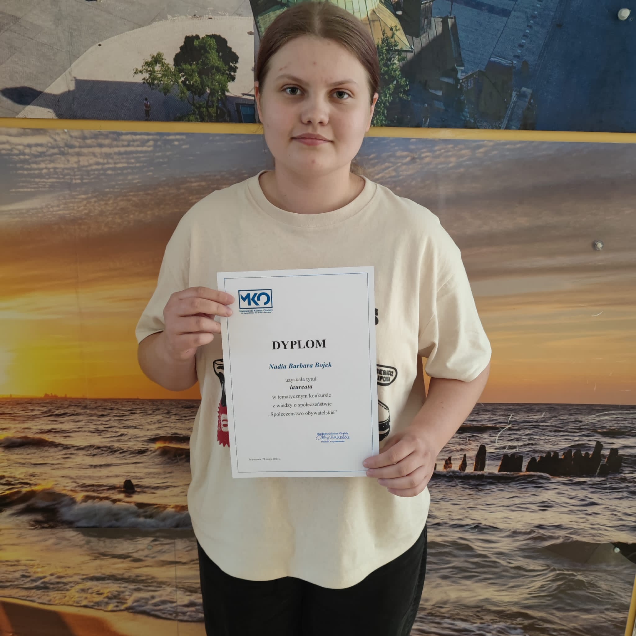 Uczennica klasy VIII Nadia Bojek uzyskała tytuł laureata w konkursie wiedzy o społeczeństwie „Społeczeństwo obywatelskie” , którego organizatorem jest Mazowiecki Kurator Oświaty. Celem konkursu jest: popularyzacja wiedzy z zakresu wiedzy o społeczeństwie, promowanie wśród uczniów postaw patriotycznych i proobywatelskich. Należy nadmienić, że Nadia znalazła się w gronie tylko 25 uczniów z województwa mazowieckiego , którzy wzięli udział w etapie finałowy.