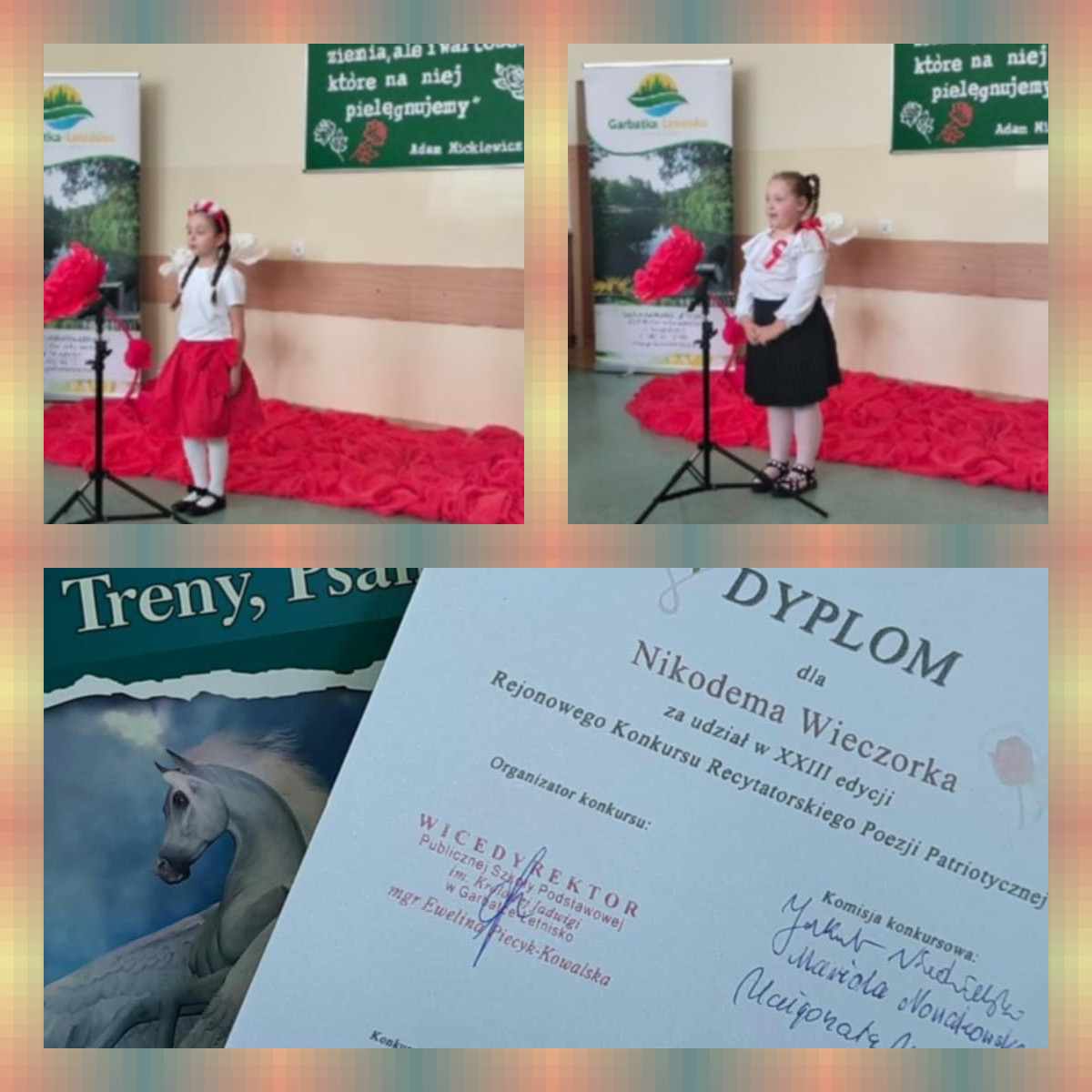 Kaja powiedziała leciutko i zwiewnie wiersz J. Białobrzeskiej „Moja mała ojczyzna”, Nadia zmierzyła się z utworem „Modlitwa polskiego dziewczęcia” W. Bełzy i wyrecytowała go z uroczym dziecięcym zaangażowaniem, a Nikodem na swój niepowtarzalny sposób zaprezentował wiersz Wandy Chotomskiej „Dwa fortepiany”, przypominając wszystkim o Żelazowej Woli i Fryderyku Chopinie. Ich występy były wyrazem patriotyzmu oraz poetyckiej wrażliwości.