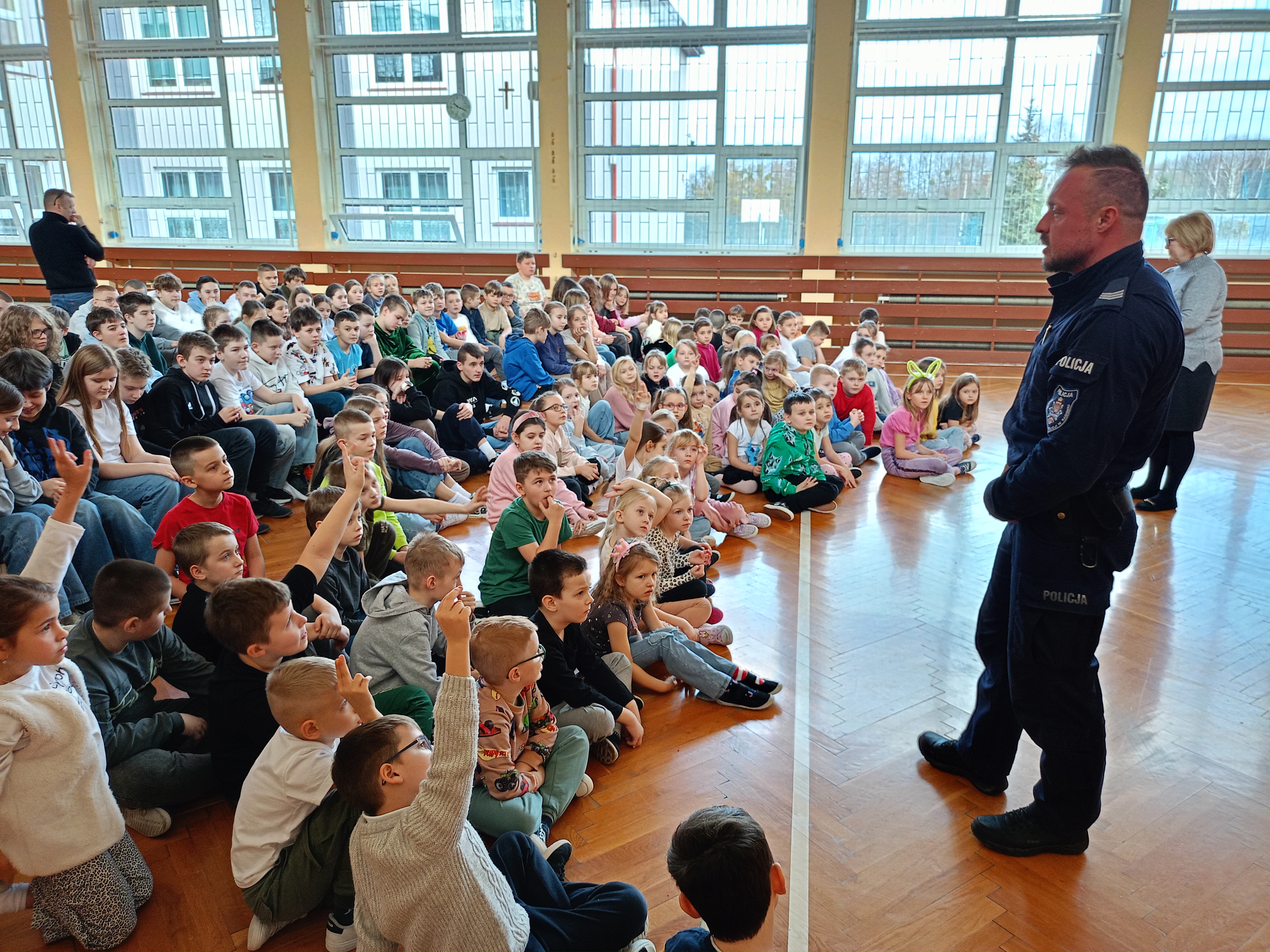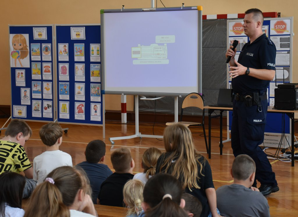 Z uczniami spotkał się przedstawiciel Komisariatu Policji w Pionkach mł. asp. Grzegorz Ociepa. Podczas prelekcji uczniowie zostali zapoznani z najistotniejszymi zagadnieniami odnoszącymi się do bezpieczeństwa podczas wakacji. Przestrzegano przed nieodpowiedzialnym korzystaniem z dróg jednocześnie zwracając uwagę na przestrzeganie przepisów ruchu drogowego. Wskazywano niebezpieczeństwa związane z nieodpowiedzialnym zachowaniem podczas zabaw na świeżym powietrzu. Poruszono tematykę wszelkich zachowań ryzykownych, oraz zagrożeń wynikających z używania substancji psychoaktywnych. Poruszono również tematykę bezpiecznego korzystania z internetu. Nie zabrakło przypomnienia zasad reagowania w sytuacjach zagrożenia w tym korzystania z numerów telefonów alarmowych. W ramach wystąpienia mł. asp. G. Ociepy uczniowie obejrzeli film profilaktyczny poruszający najistotniejsze zagadnienia odnoszące się do bezpiecznego wypoczynku w czasie wakacji.