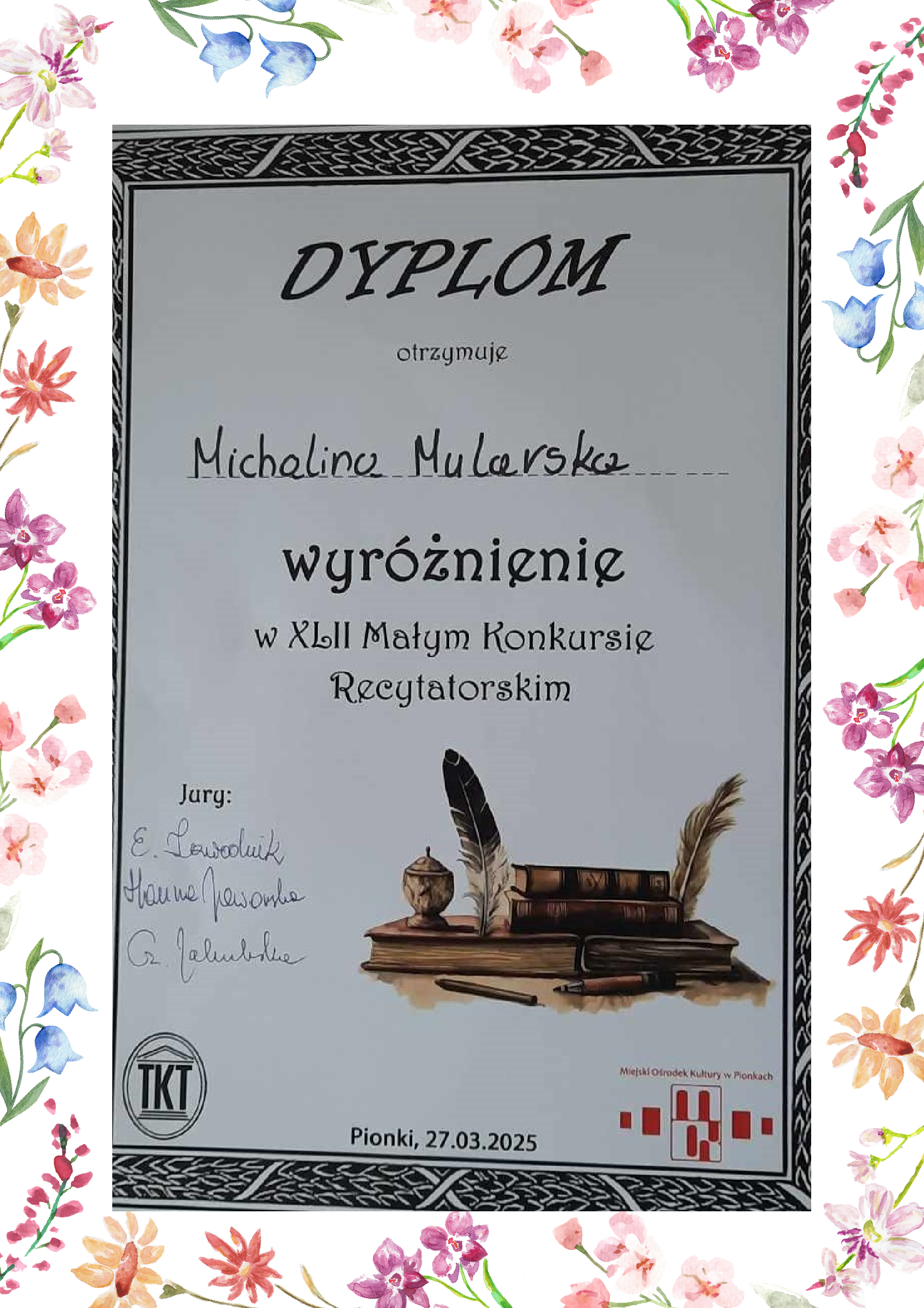 Dzielimy się radością, informując, że Anastazja Mazur z klasy V została nagrodzona w XXXI Ogólnopolskim Konkursie Poetyckim im. Janusza Korczaka organizowanym przez MDK im. Króla Maciusia Pierwszego w Płocku.