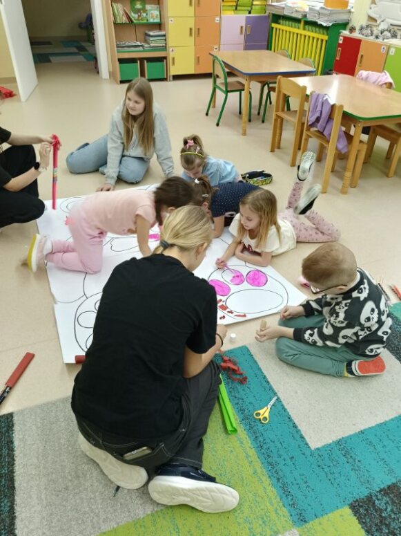 W drugiej części spotkania dzieci pod kierunkiem uczennic z kl. 6, wykonały kreatywne zadania: ożywiły las, rzekę, pomalowały gipsowe jeżyki.